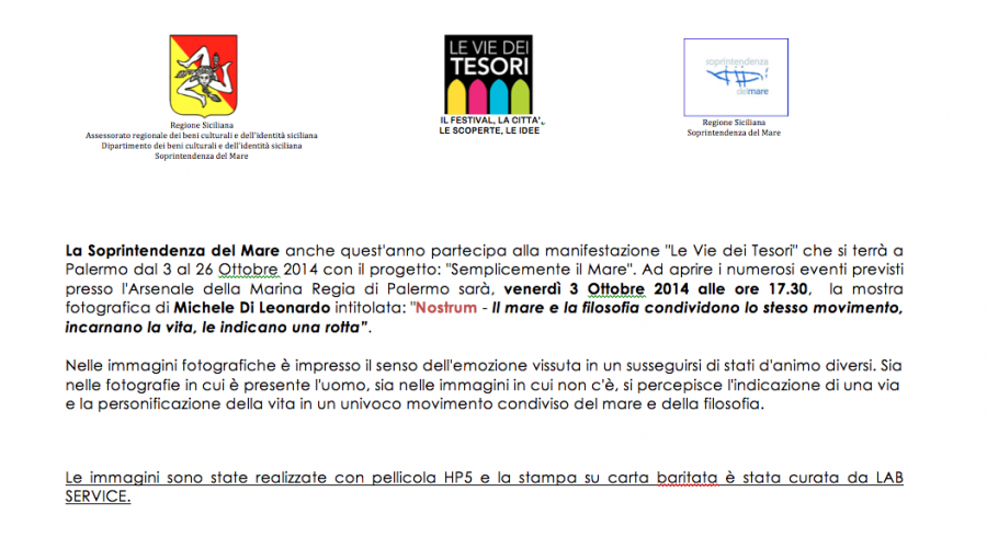 La Soprintendenza del Mare apre "Le Vie dei Tesori" presso l'Arsenale della Marina Regia con la mostra fotografica di Michele Di Leonardo intitolata: "Nostrum - Il mare e la filosofia condividono lo stesso movimento, incarnano la vita, le indicano una rotta”.Nelle immagini fotografiche è impresso il senso dell'emozione vissuta in un susseguirsi di stati d'animo diversi. Sia nelle fotografie in cui è presente l'uomo, sia nelle immagini in cui non c'è, si percepisce l'indicazione di una via e la personificazione della vita in un univoco movimento condiviso del mare e della filosofia.